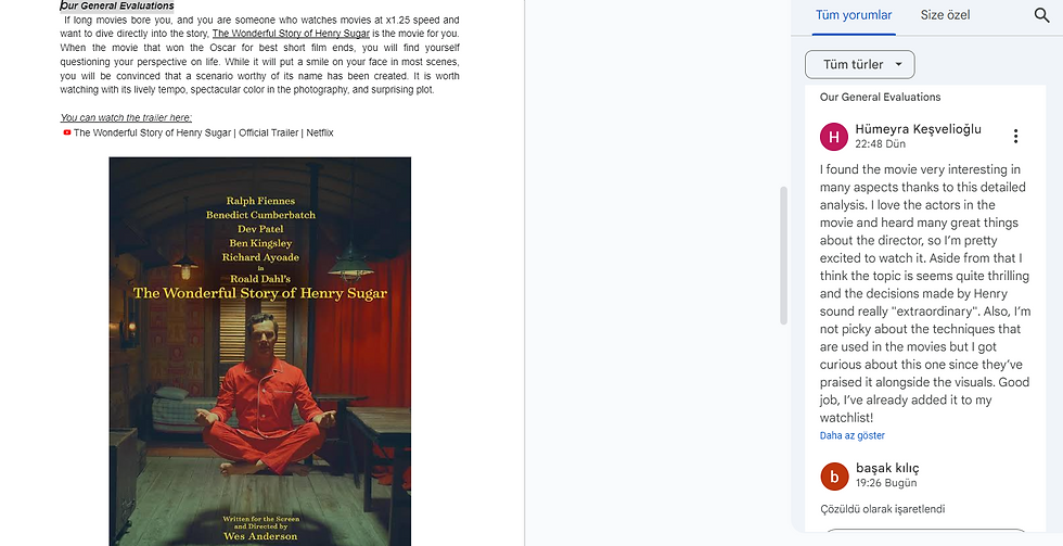 Hello everyone, I hope you are in a good mood and enjoy my new blog post! My friends Başak Pınar and I are here with another great movie review. After a short research, we decided to watch and review the wonderful story of Henry Sugar because it had a very unusual sequence of events, so we were all very interested in this movie and we thought it would be very exciting to watch this movie and then review it, so we immediately got to work and started watching the movie. After watching the movie, we made a short evaluation among ourselves and then shared our opinions and criticisms about the movie on Google Docs. Since Google Docs is a program we have used before, we did not have any difficulties in using it and we successfully overcame this stage. I can say that it was a very enjoyable movie review for all of us, and sharing our opinions about it and having other friends share their thoughts about our review and the movie improved us even more and we realized that we did a good job and we were even more motivated. We supported each other during the collaborative writing process and enjoyed writing, it was very enjoyable to work collaboratively and spend time together. We think Henry Sugar's wonderful story will move everyone incredibly fast and change their perspectives. I invite you to first read the movie review of our hard work and then watch it, you won't regret it! Have fun and see you soon, bye!